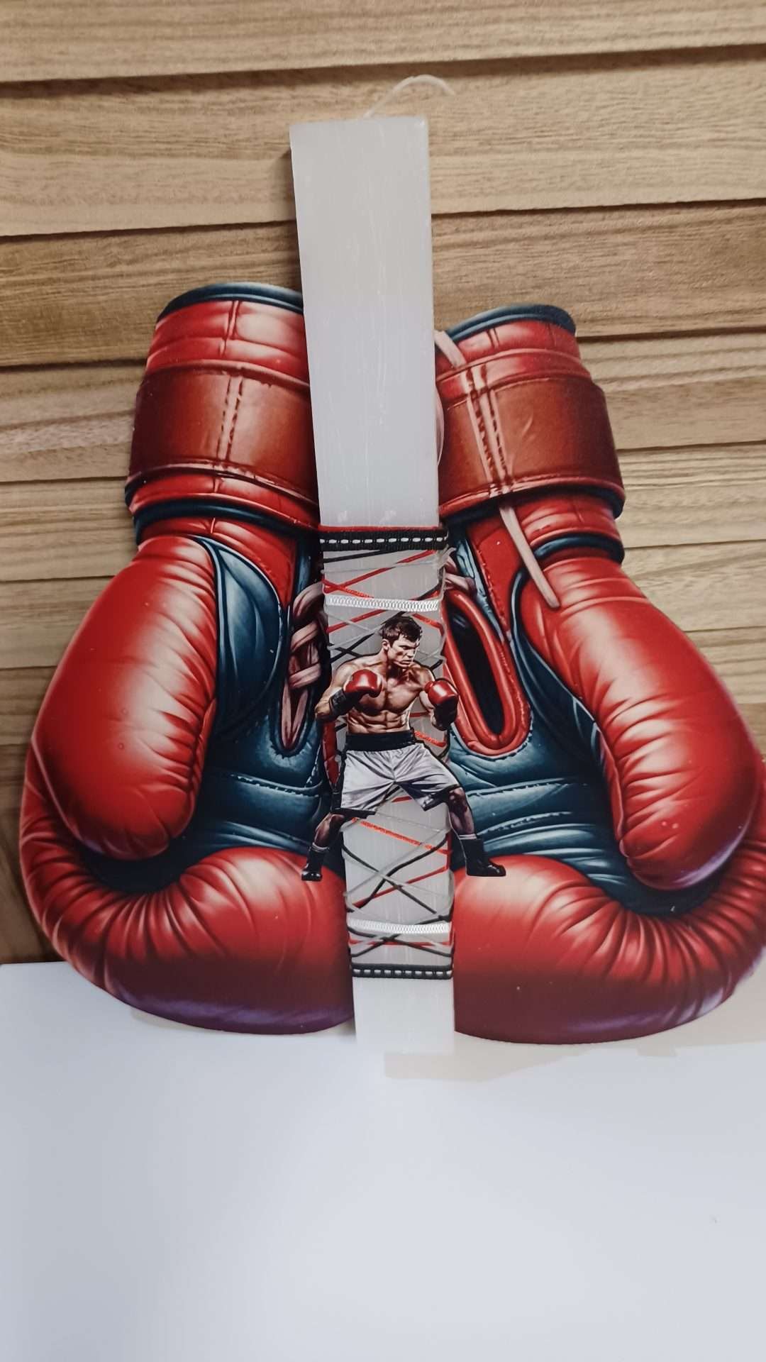 Λευκό αρωματικό κερί πλακέ με ξύλινη φιγούρα παίχτη Μποξ κ ασορτί πλάτη με γάντια μποξ…