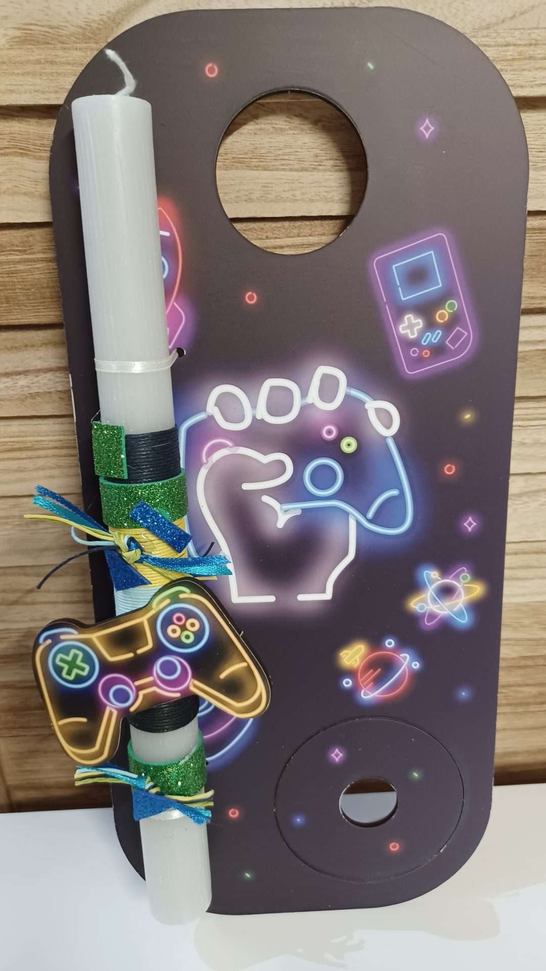 Χειροποιήτη λαμπάδα σε λευκό κερί με ασορτί πλάτη κ κοπτικό που προσαρμόζεται στο κερί για να μη στάζει.