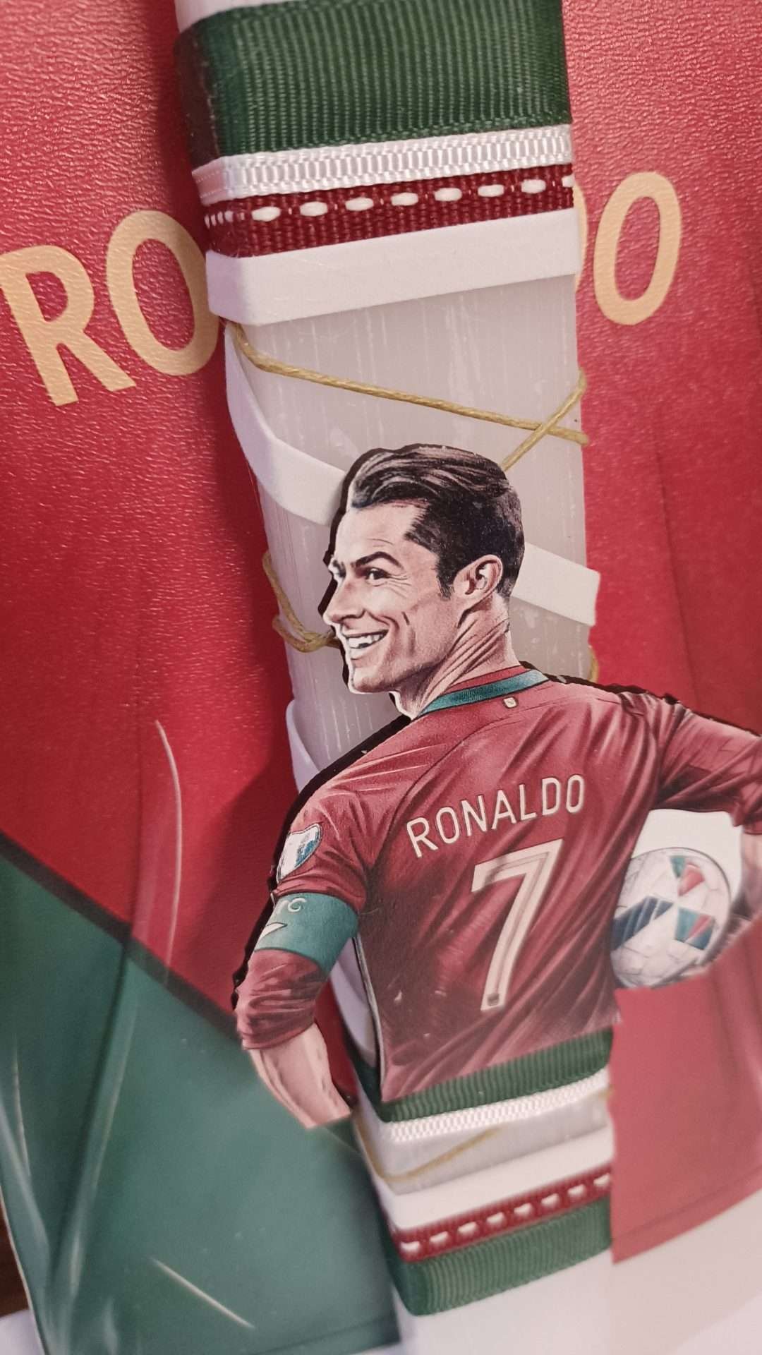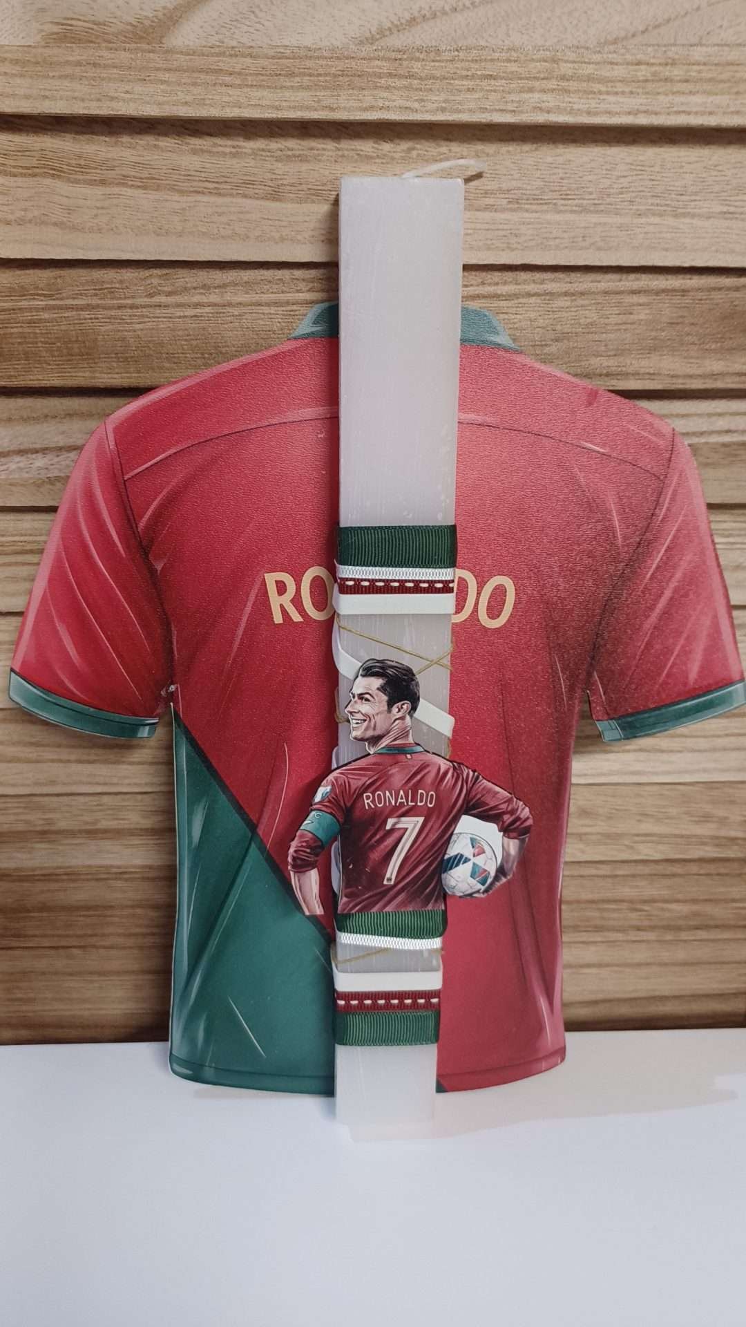 Λευκό αρωματικό κερί με ξύλινη φιγούρα του Ρονάλντο κ ασορτί πλάτη με την μπλούζα του Ρονάλντο.